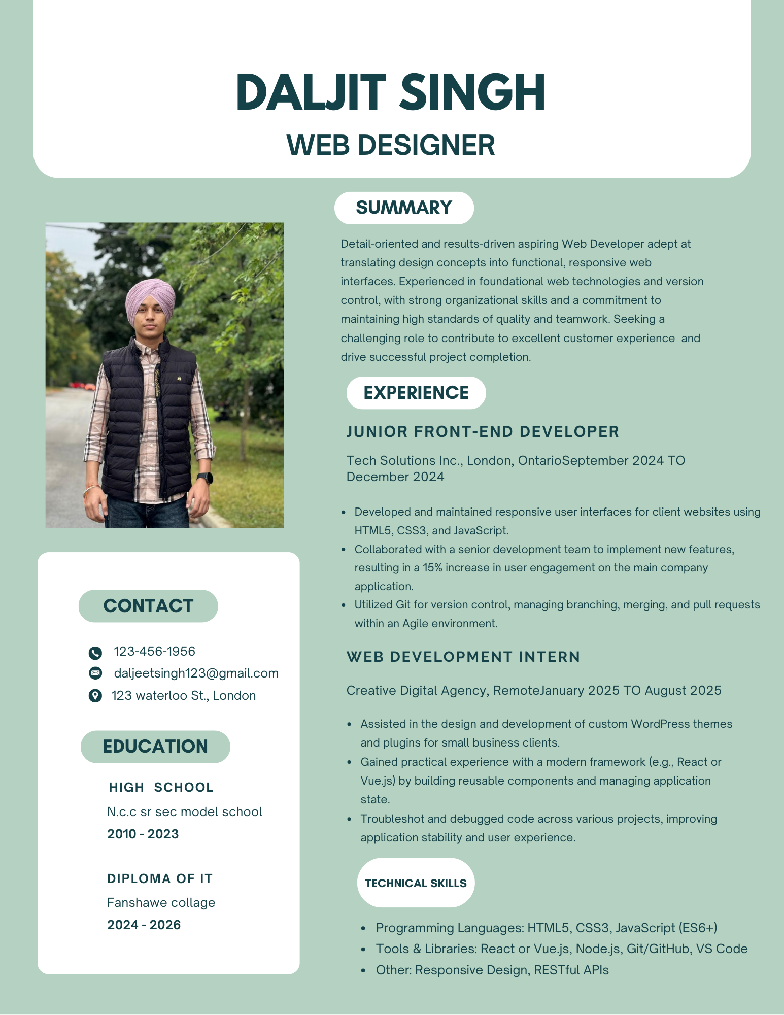 Download Resume (PDF)Hi, I’m Daljit Singh — an Interactive Media Design student at Fanshawe College who transforms ideas into immersive digital experiences. By combining creative vision with strong technical skills, I build interactive solutions that captivate, connect, and inspire.